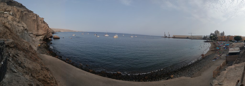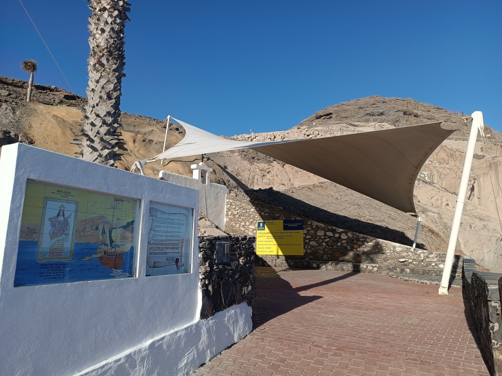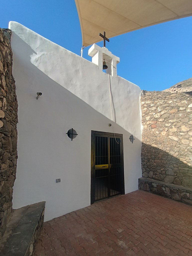 Assuming the mystery has a divine origin, you decide to traverse the town and visit the local shrine (Ermita) carved into the nearby cliff. From there, you gain a panoramic view of Santa Águeda Bay, encompassing the beach, the town, and the adjoining cement plant. If you squint, you might even discern the Maspalomas lighthouse across the bay.