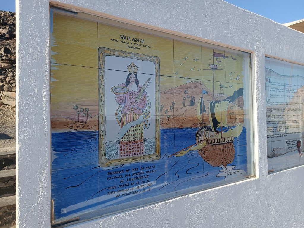 The bay gets its name from the holy figure living inside the small cave-shrine behind you. That’s where the soul of El Pajar resides. Saint Águeda was a Christian martyr, and her story is summarized in the mural nearby. While her martyrdom is described only in Spanish, the artistic depiction makes it self-explanatory.