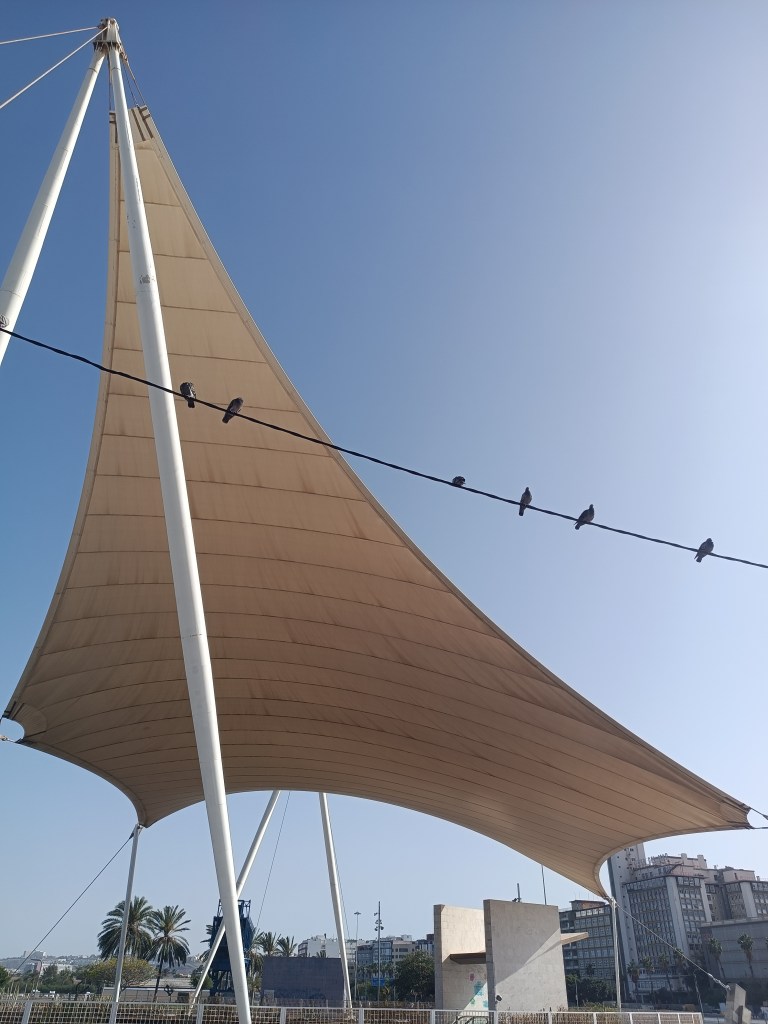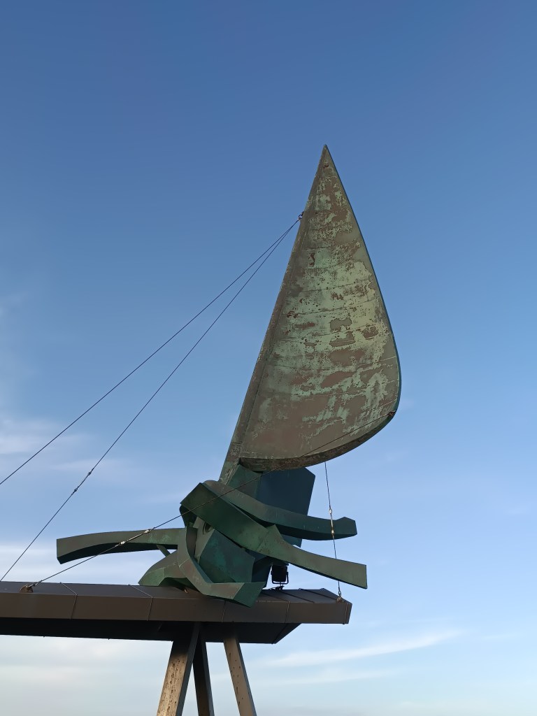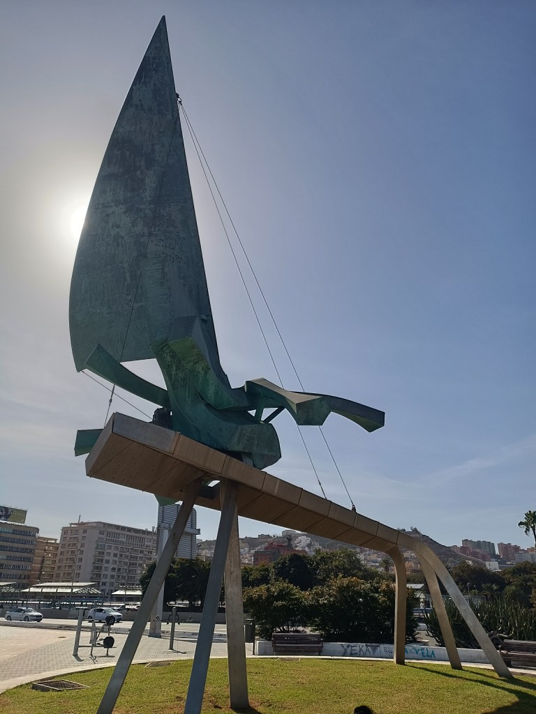 A bit further ahead, and you have reached the city centre straddling the Guiniguada ravine. A picture frame marks the spot. You should stop here for Chapter 6, including Vegueta (the old town) and Triana (high-street shopping). If you travel by bus, the relevant bus stop is the “Teatro” one that Lund visits in that chapter. Alternatively, you can alight at the San Telmo Bus Station, not far from which there is the next sculpture — an homage to lateen sailing, whose regattas take place every spring and summer just in front of the seawall.